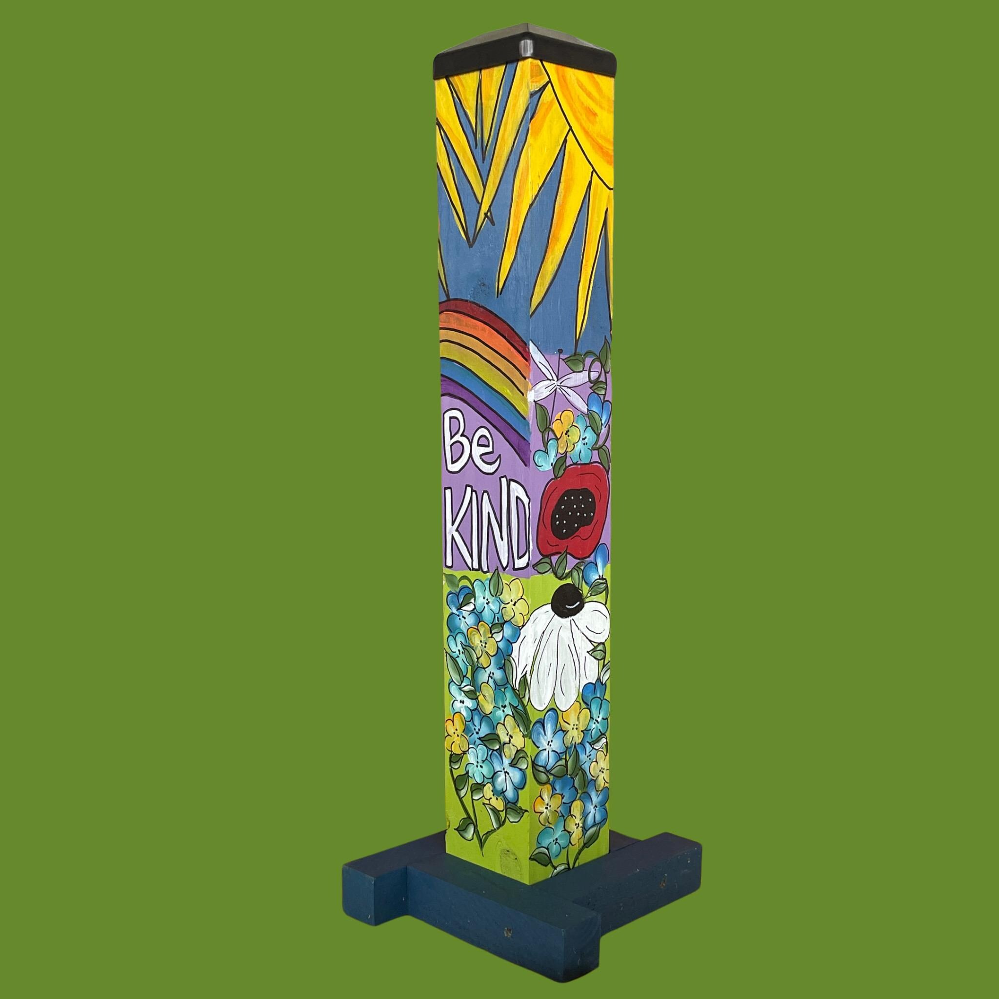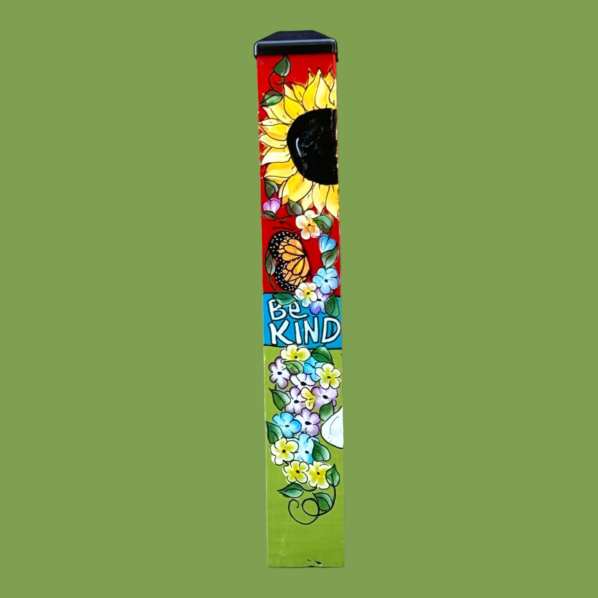 Our *BE KIND* hand-painted garden post adds a whimsical and vibrant touch to your garden, porch, or patio. Adorned with colorful flowers, butterflies, birds, and other charming garden creatures, This cheerful garden post is the perfect way to brighten up any outdoor space with a message of kindness and joy!