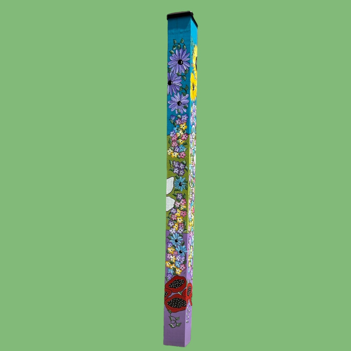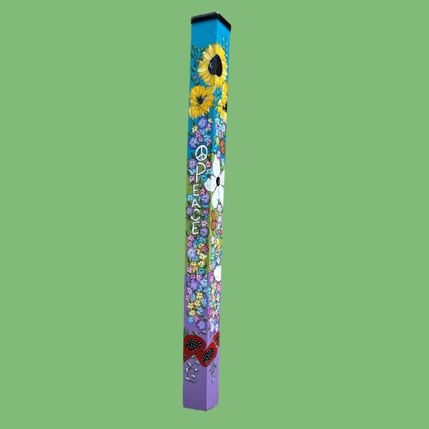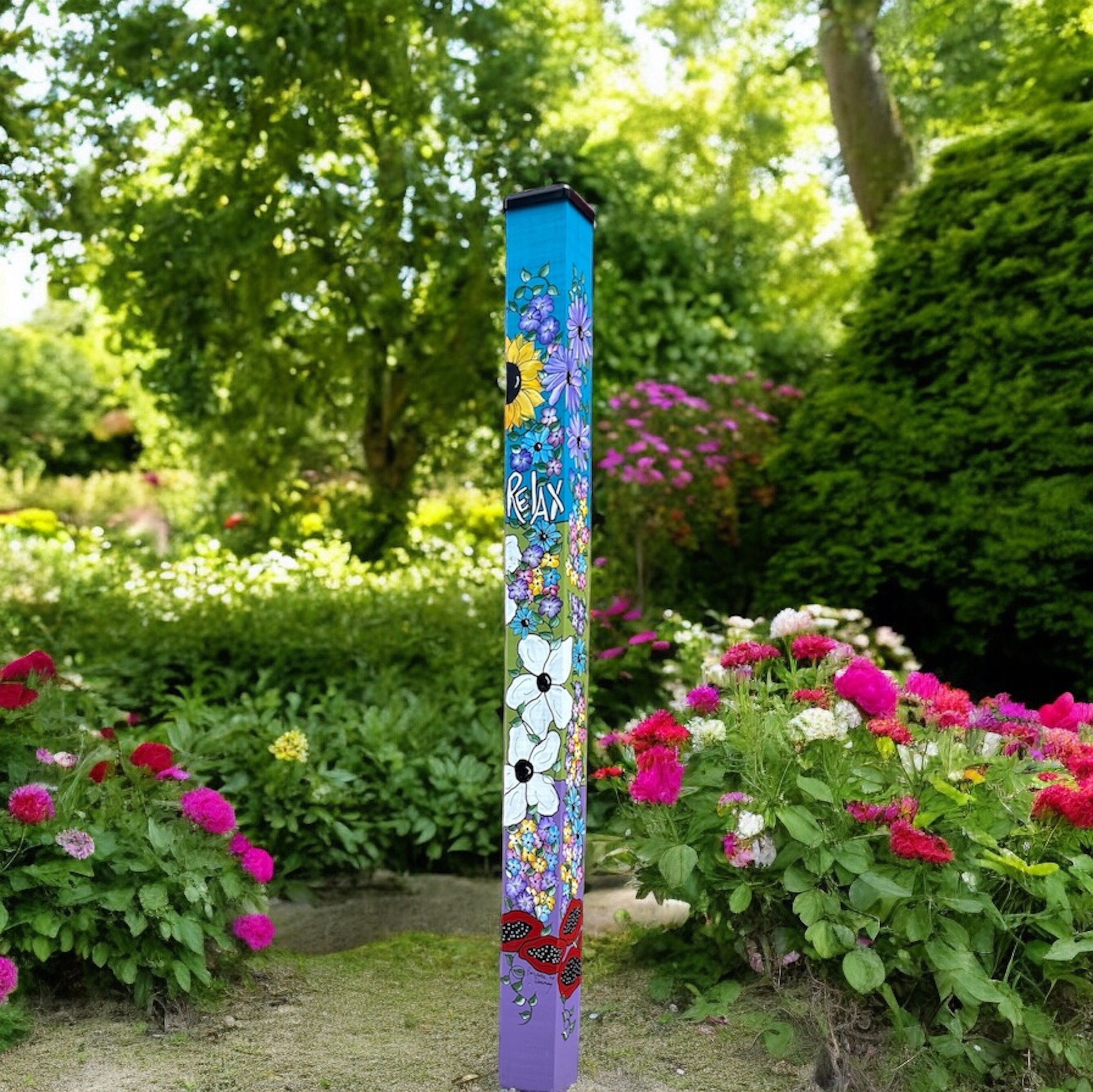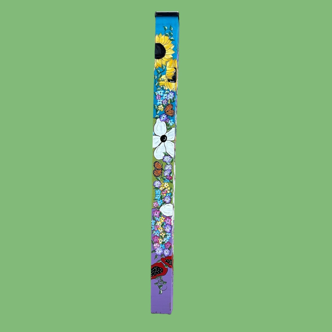 Each Hand painted garden post will add that whimsical bright touch of color to your garden, porch or patio. Painted with lots of flowers, some with butterflies, birds and other garden friends, and message Relax and Peace.