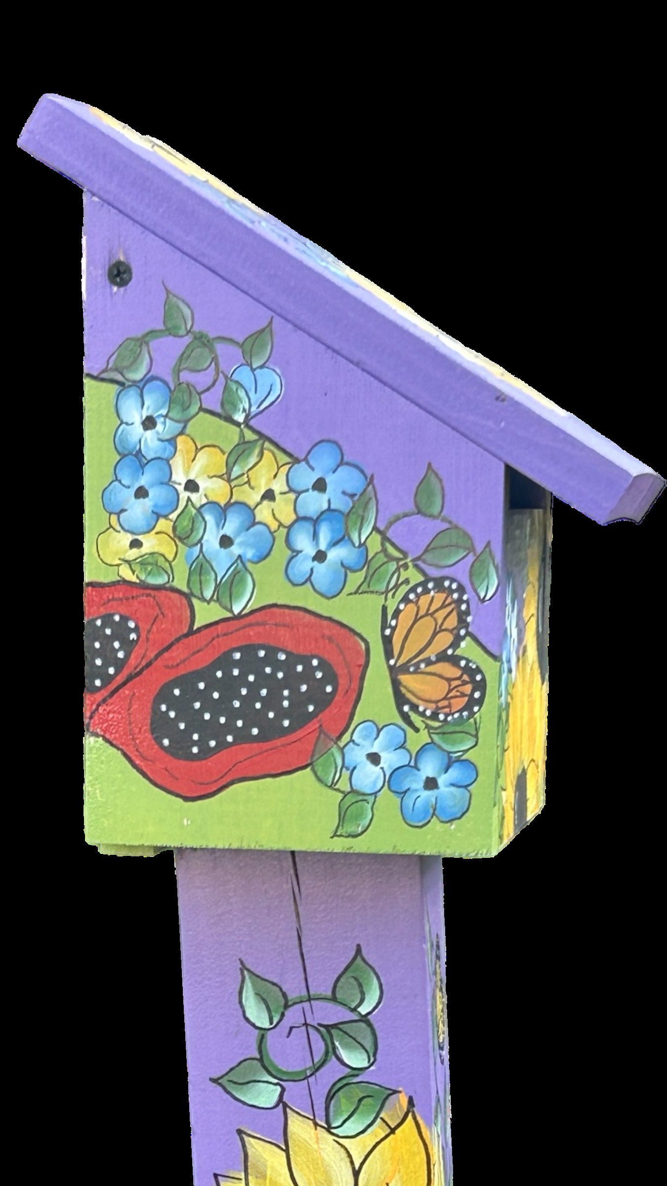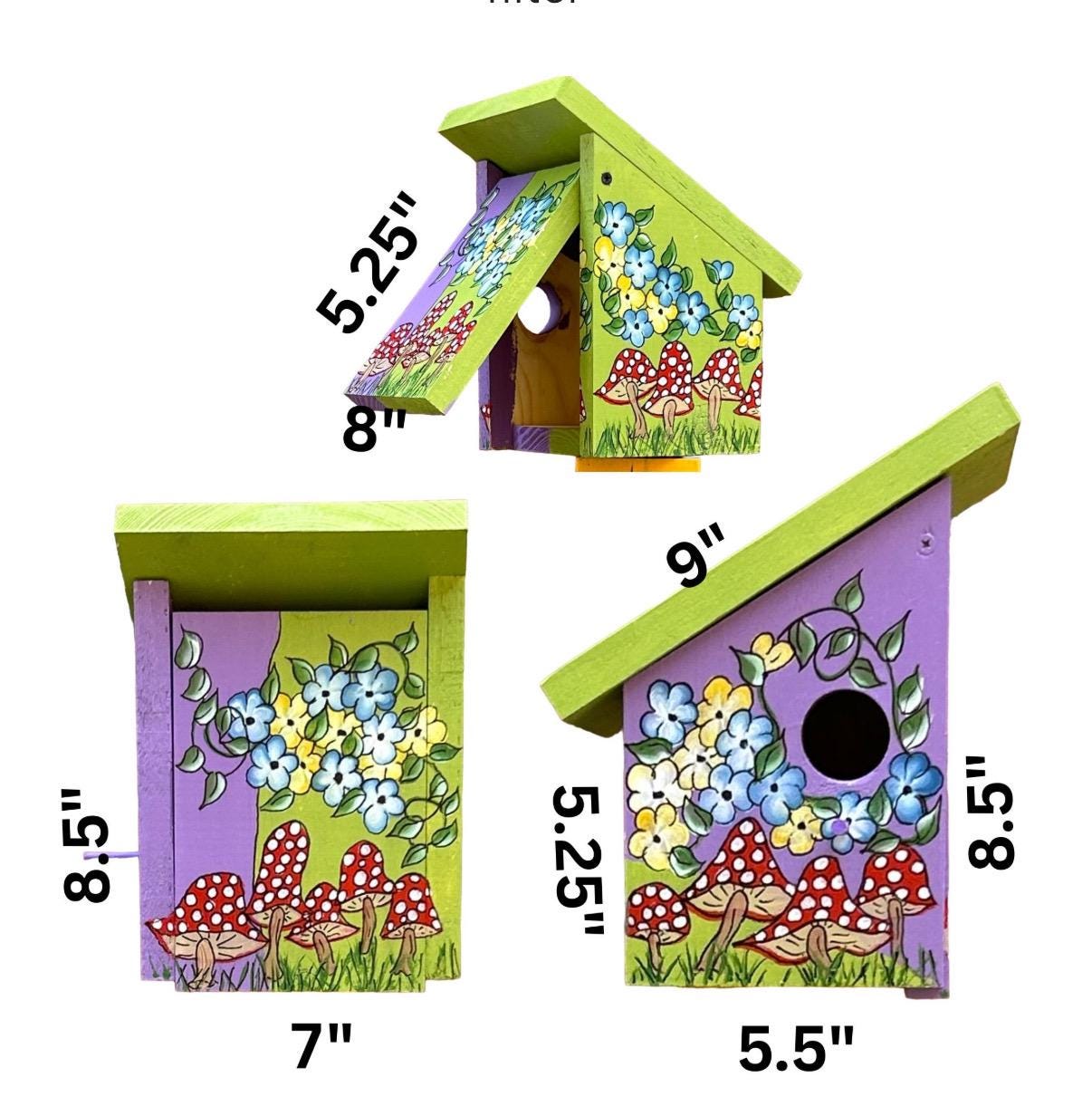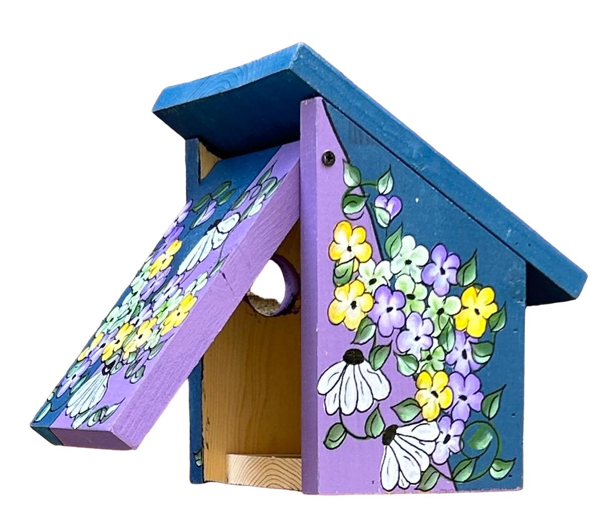 Hand-painted birdhouses are charming and vibrant, each one uniquely adorned with a burst of colors and intricate designs. These birdhouses are crafted with careful attention to detail, showcasing an array of beautiful flowers that seem to bloom right out of the wooden structures. Each birdhouse features a variety of floral patterns, from poppies and daisies to bold sunflowers and tulips, all painted in vivid hues that catch the eye and bring a touch of nature’s beauty into any garden.