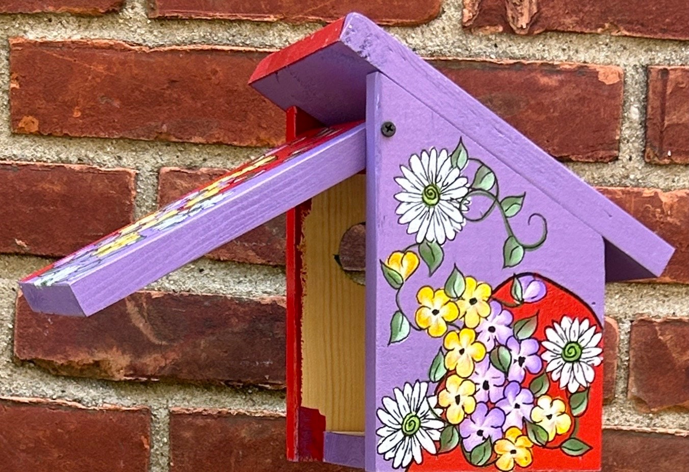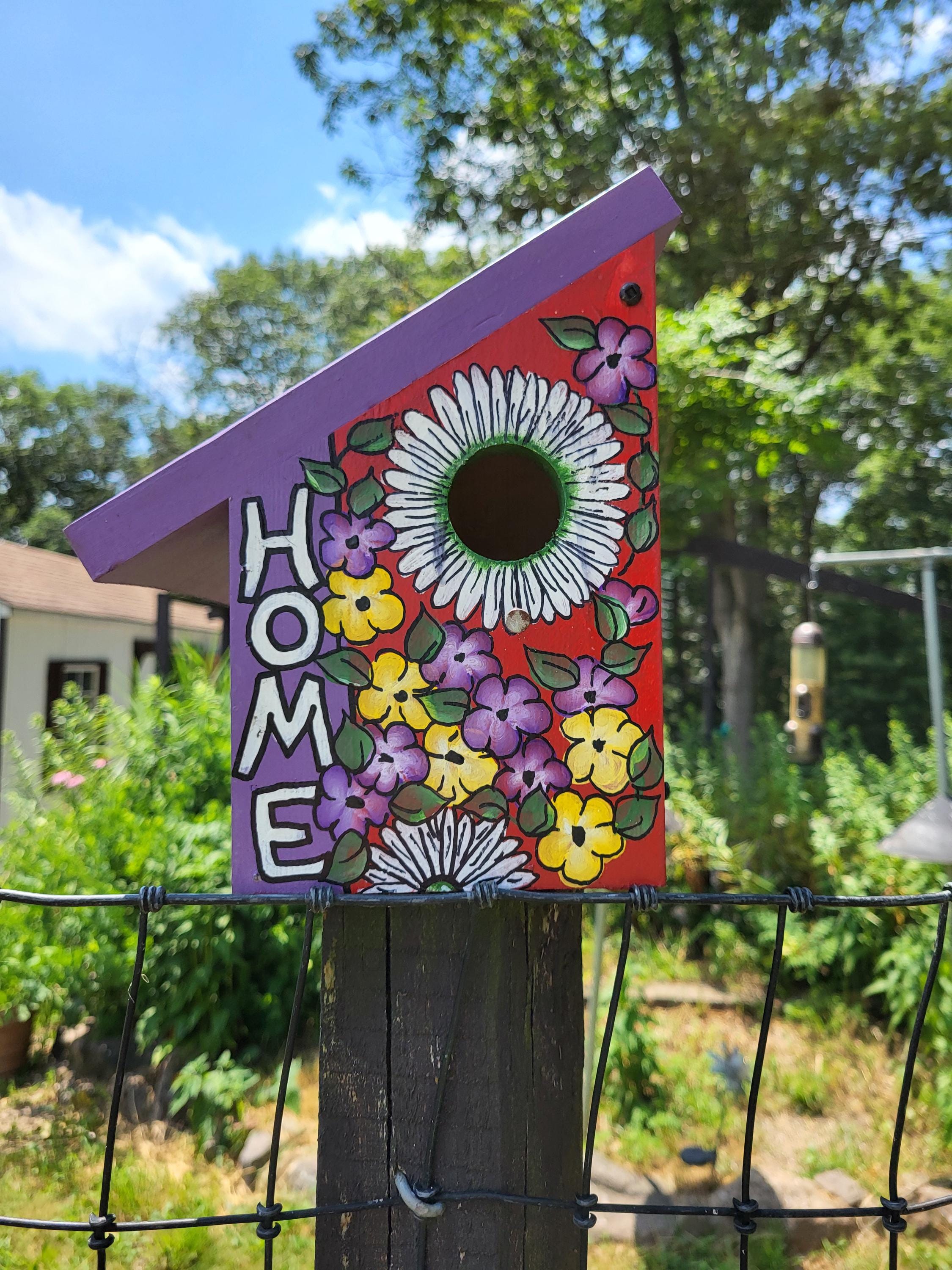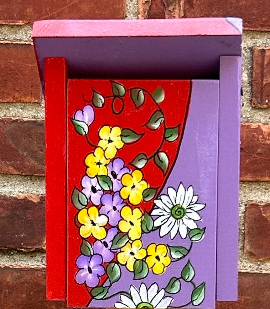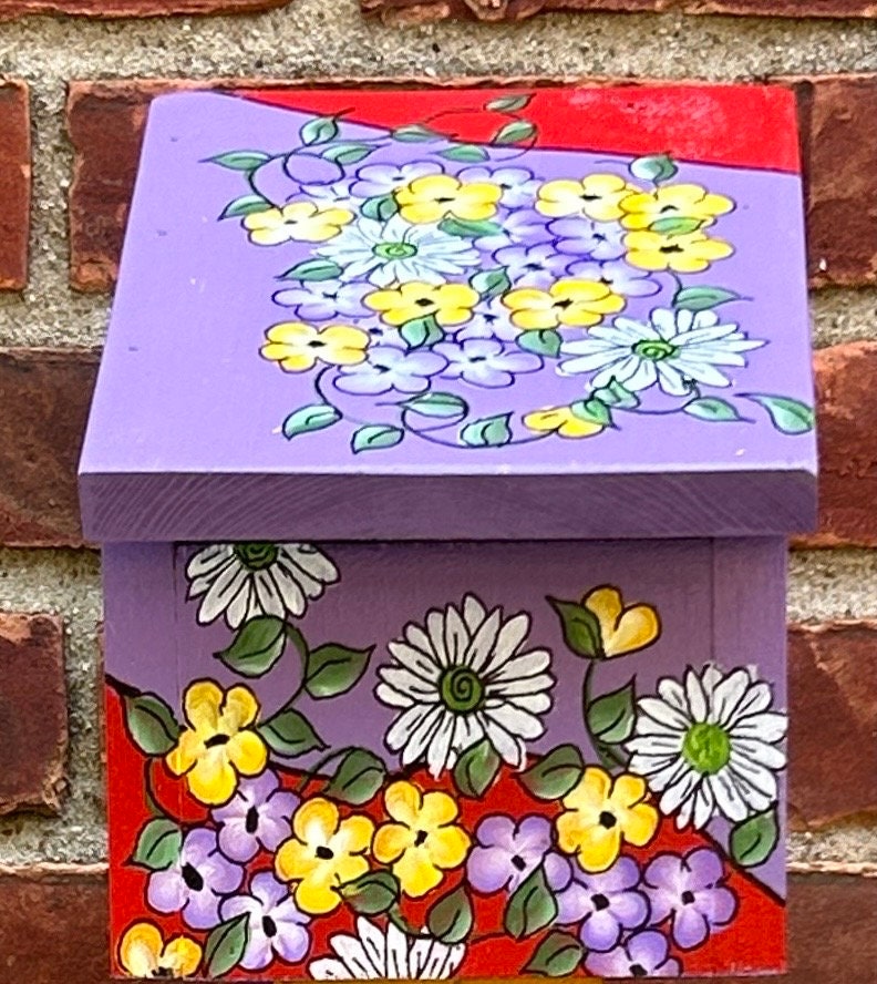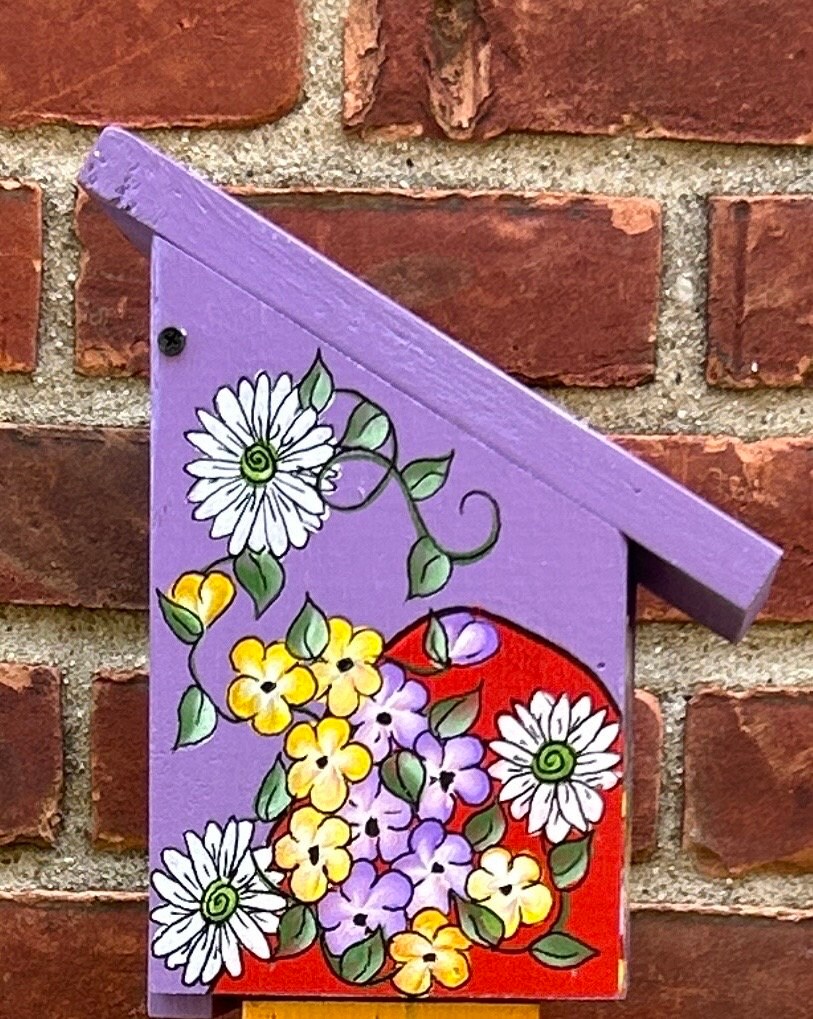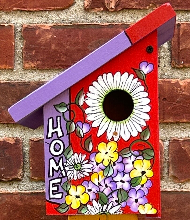 Hand-painted birdhouses are charming and vibrant, each one uniquely adorned with a burst of colors and intricate designs. These birdhouses are crafted with careful attention to detail, showcasing an array of beautiful flowers that seem to bloom right out of the wooden structures. Each birdhouse features a variety of floral patterns, from poppies and daisies to bold sunflowers and tulips, all painted in vivid hues that catch the eye and bring a touch of nature’s beauty into any garden.