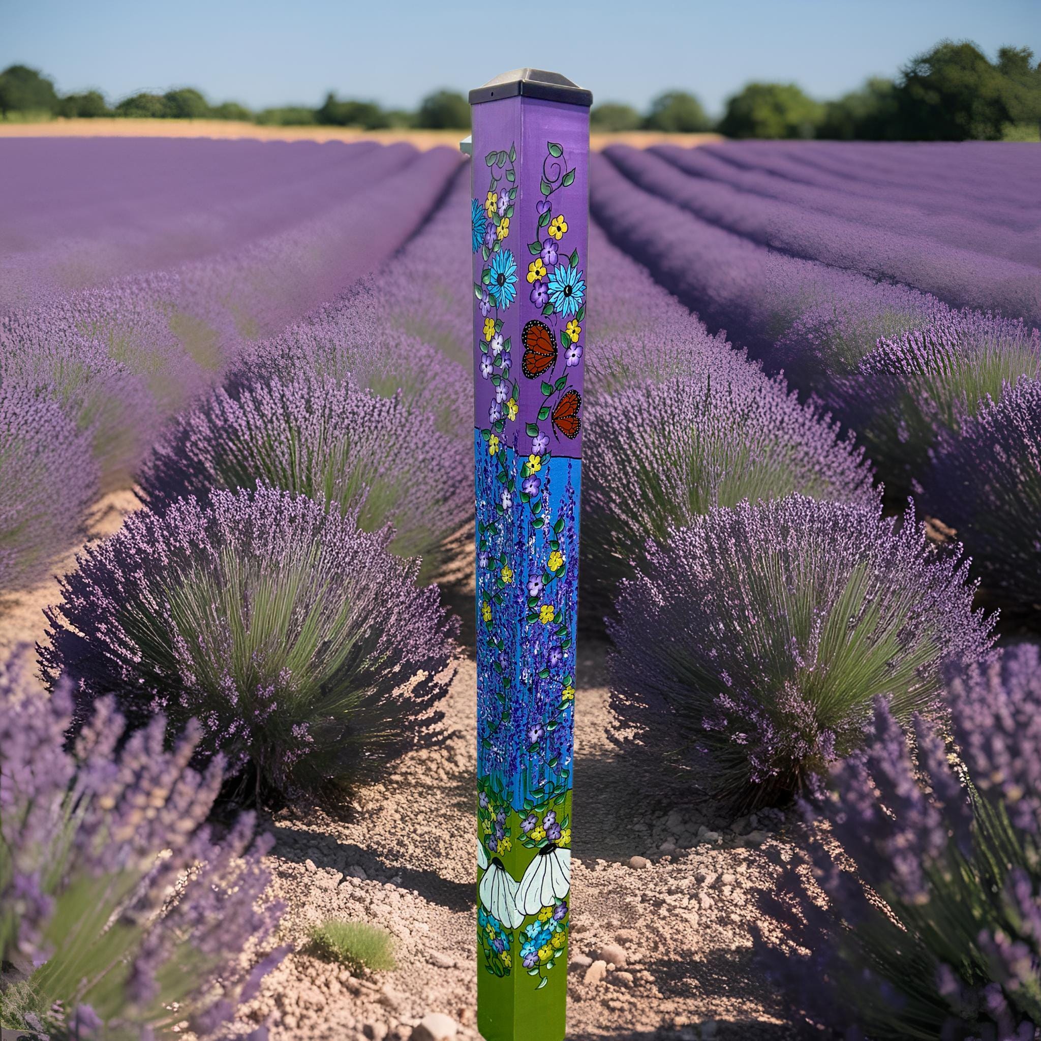 Sprinkle some floral fun in your garden or on your patio with our Garden Post Lavender Blooms Garden Post—a handmade rustic delight that turns any yard or patio into a whimsical garden wonderland. Unlike plastic décor, this sign is crafted with love and real-care for detail, giving your garden that authentic, artsy vibe only nature and craftsmanship can create.